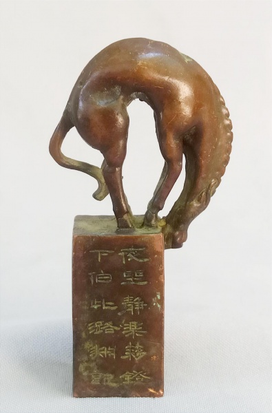 BRONZE, um (1) imponente sinete oriental, encimado por cavalo, base e uma das laterais em caracteres, medindo 8,5 cm altura, peso aproximado 250 gr., ...