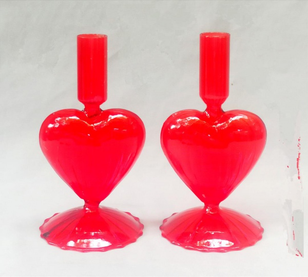 VIDRO, par (2) castiçais vermelhos e translúcidos, canelados na vertical, fuste no formato de coração, bobeche cilíndrica, base terminando em saia, ...