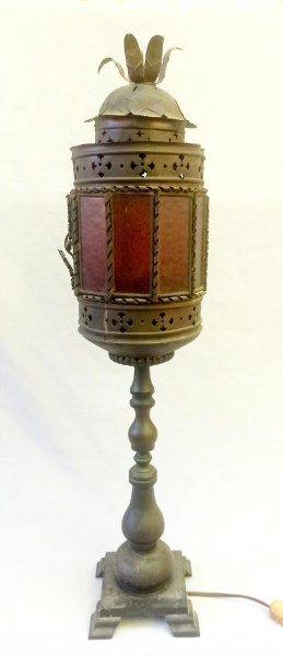 LUMINÁRIA, um (1) abat-jour tipo lanterna oriental para um lume, base em ferro, cúpula em folha de flandres com apliques em vidro, parte elétrica não ...