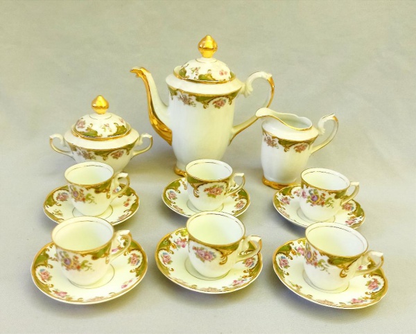 PORCELANA, conjunto para café com nove (9) itens: 1 bule; 1 cremeira; 1 açucareiro e 6 xícaras, manufatura REAL (Mauá, SP, 1943 a 1994), ornamentação ...