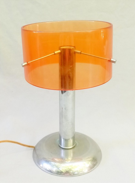 LUMINÁRIA, um (1) abat-jour para um lume, anos 70, cúpula em acrílico com pequeno rachado onde prende o metal, estrutura em aço inox, medindo 32 cm ...