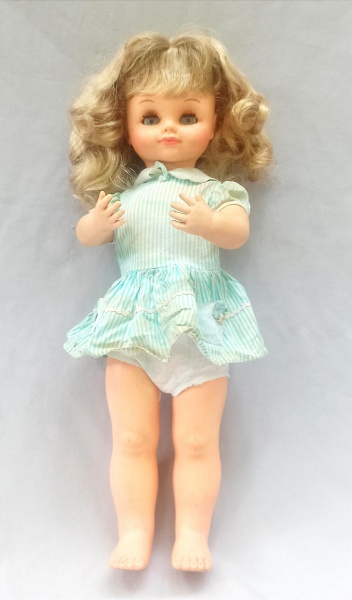 BRINQUEDO, uma (1) boneca, MAESINHA, anos 70, marca ESTRELA, cabeça em biscuit, olhos de vidro com movimento pendular, dispositivo sonoro a corda ...