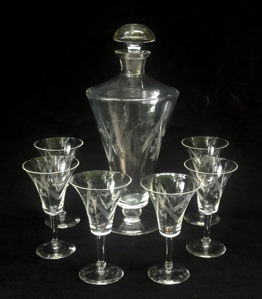 DEMI CRISTAL, conjunto para licor com sete (7) itens, incolores e translúcidos: 1 licoreira com tampa e de pé baixo, bojo obcônico com singela ...