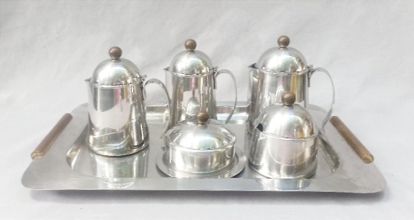 AÇO INOX, baixela para chá e café com seis (6) itens: 1 bandeja; 2 bules; 1 cremeira; 1 manteigueira e 1 açucareiro, marcadas NOVA METAL exceto na ...