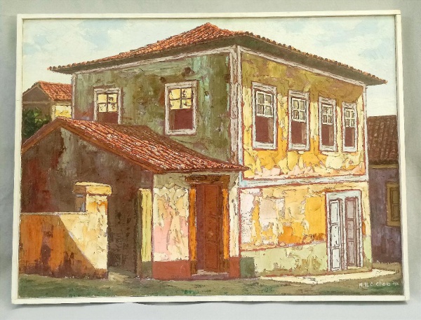 M. N. A. CHOLO, uma (1) pintura representando Casa Colonial, OST, assinado e datado 73 no CID, verso: autenticado, intitulado Colonial Brasileiro e ...