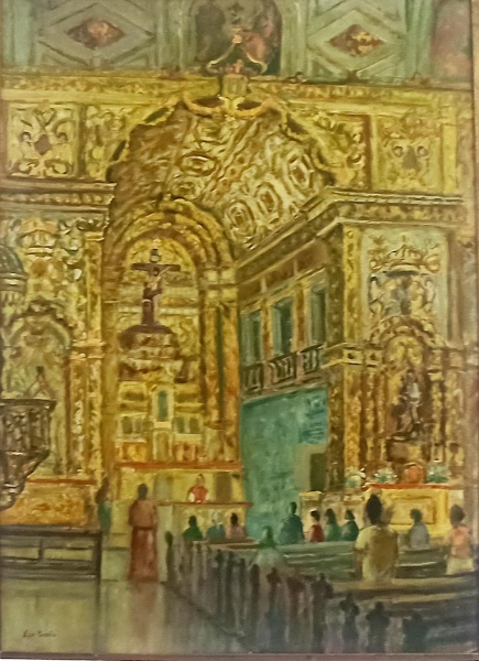 ESSE PIMENTA, uma (1) pintura iconográfica representando Interior da Igreja São Francisco, Salvador, Bahia, OST, assinado no CIE, verso: intitulado e ...