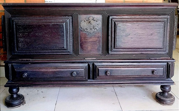 MOBILIÁRIO, um (1) antigo bar tipo arca, confeccionado em madeira maciça, frontal com porta de abertura basculante, espelho e dobradiças em ferro, ...