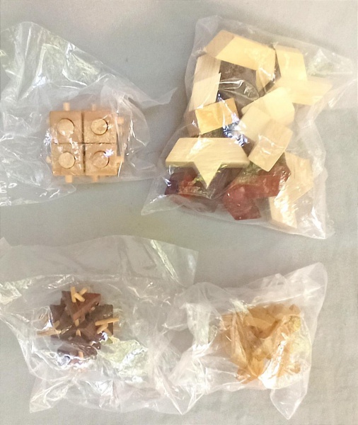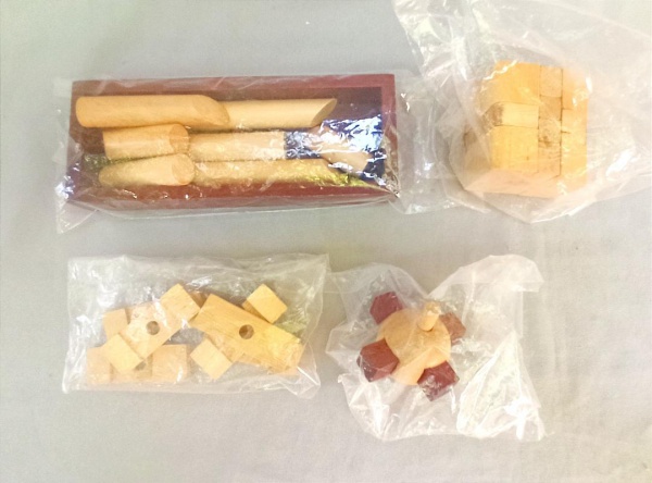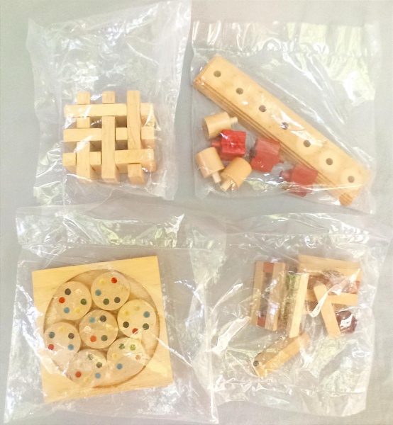 • BRINQUEDOS, quatro (4) distintos, confeccionados em madeira, todos vinham acompanhando a revista JOGOS DE DESAFIO, Editora SALVAT,  usados, vide foto.
