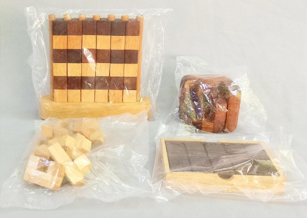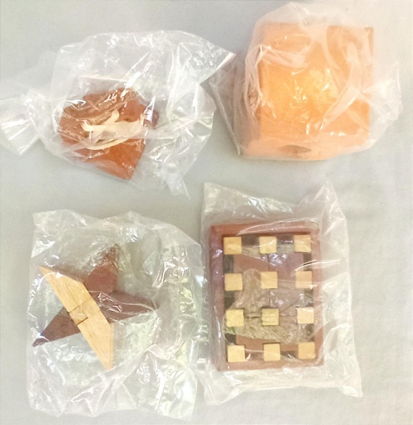 • BRINQUEDOS, quatro (4) distintos, confeccionados em madeira, todos vinham acompanhando a revista JOGOS DE DESAFIO, Editora SALVAT,  lacrados e sem uso, vide foto.
