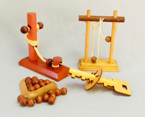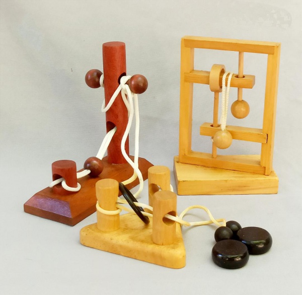 • BRINQUEDOS, três (3) distintos, confeccionados em madeira, todos vinham acompanhando a revista JOGOS DE DESAFIO, Editora SALVAT,  usados, vide foto.