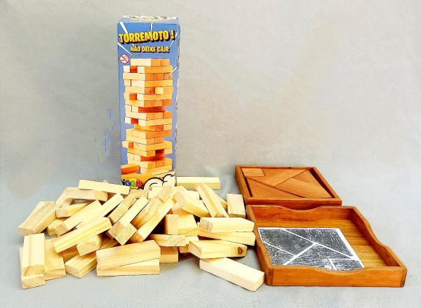 • BRINQUEDOS, dois (2) distintos, confeccionados em madeira e acondicionados na caixa original, sendo: 1 TORREMOTO, marca GGB; 1 confeccionado pelo Atelier ARTE JANE  RJ, ambos com sinais de uso, vide foto.