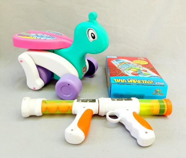 • BRINQUEDOS, três (3) itens: 1 jogo tira varetas da ART BRINK, caixa original; 1 tartaruga com rodas de puxar; 1 lançador de bolinhas de espuma SUPER SHOT, marca DM TOYS, faltam os alvos, medindo 40 x 20 x 7 cm, todos os itens usados, vide foto.