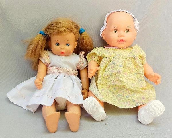 • BRINQUEDOS, duas (2) bonecas: 1 Baby Carinho da Home Play, confeccionada em vinil, medindo 40 cm, não possui os acessórios; 1 com corpo de pano, rosto braços e pernas em vinil, Made in Spain, FALCA, olhos pendulares, dispositivo de voz, não testado e sem garantia, demanda limpeza, ambos os itens usados, vide foto.