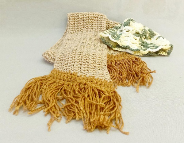 • ACESSÓRIO FEMININO, dois (2) itens: 1 gorro confeccionado em lã, tonalidades verde, branco e amarelo, criando efeito mesclado, tamanho único; 1 cachecol em lã, crochê, tonalidade bege, franjas longas na tonalidade marrom, medindo 120 x 15 cm mais a franja, sinais de uso, vide foto.