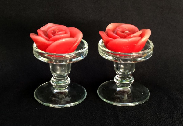 • VIDRO FRANCÊS, par (2) castiçais, incolores e translúcidos, fuste no formato de balaustre, base em bolacha, legenda de origem FRANCE em relevo na própria modelagem, acompanham duas velas no formato de flor na tonalidade vermelha, medindo 8 cm altura e diâmetro, vide foto.