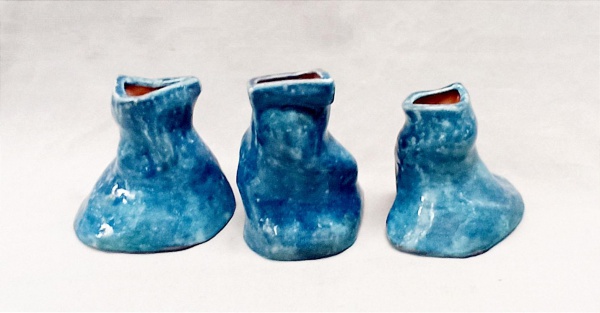 • CERÂMICA, três (3) vasos floreiros amorfos, com esmaltação vítrea na tonalidade azul, assinatura NAZARETH VELLOSO, parcialmente legível, medindo o maior 13 cm altura, vide foto.