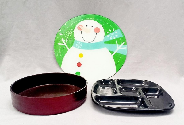 • DIVERSOS, três (3) itens distintos: 1 porta petiscos com divisórias, confeccionado em polímero, tonalidade preta; 1 bandeja circular em laca, medindo 24 cm diâmetro; 1 prato para torta ou bolo, confeccionado em vidro, ornamentação esmaltada em policromia representando boneco de neve, marca MOR CASA E LAZER, medindo 35 cm diâmetro, todos os itens com sinais de uso, vide foto.