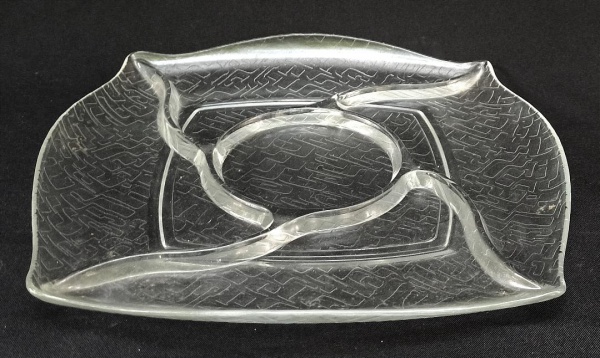 • VIDRO, uma (1) petisqueira com divisória, incolor e translúcida, medindo 29,5 x 29,5 cm, vide foto.