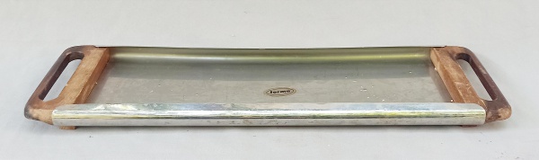 • AÇO INOX, uma (1) bandeja retangular oblonga, alças em madeira, selo da marca FORMA, medindo 45,5 x 14 cm, sinais de uso.