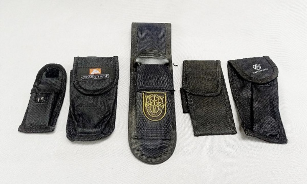 • MILITARIA, cinco (5) estojos maleáveis confeccionados em material sintético para fixação no cinto, medindo o maior 23,5 cm comprimento, vide foto.