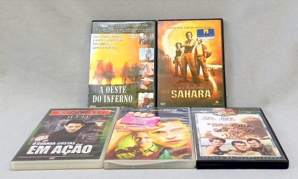 • CINEMA, cinco (5) DVDs: Sahara; A Oeste do Inferno; A Bravura de Um Soldado; Clube da Luta; O Guarda Costas em Ação, todos cópias, usados, não testados e sem garantia, vide foto.