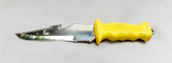 • CUTELARIA, uma (1) faca para pesca submarina e mergulho, modelo OCEAN, marca TRAMONTINA, lâmina em aço, empunhadura emborrachada na tonalidade amarela, bainha em polímero duro e borracha, medindo com bainha 31 cm comprimento, sinais de uso, vide foto.