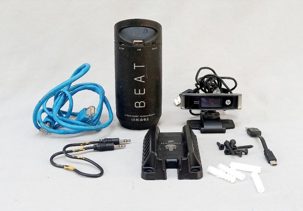 • INFORMÁTICA E OUTROS, dois (2) itens: 1 WEBCAM HP, resolução 1080p, foco automático; 1 caixa de som portátil, bluetooth, modelo C3Tech SP  B50BK; além de outros cabos e fios, vide foto, todos com sinais de uso e sem garantia.