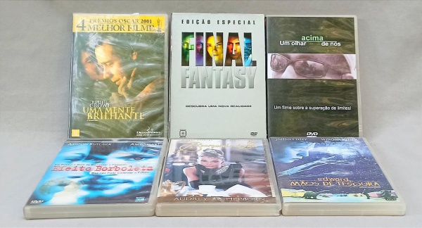 • CINEMA, sete (7) DVDs: Edward, Mãos de Tesoura; Bonequinha de Luxo; Efeito Borboleta; Acima Um Olhar de Nós; Final Fantasy (duplo); Uma Mente Brilhante (lacrado e sem uso), a maioria com sinais de uso, não testados e sem garantia, alguns cópia, vide foto.