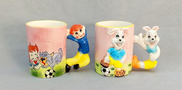 • FAIANÇA, duas (2) canecas, modeladas e ornadas com motivos infantis e de futebol em policromia, pequenas perdas na borda, sem marca de manufatura aparente, medindo 9,5 cm altura e 7,5 cm diâmetro, sinais de uso, vide foto.