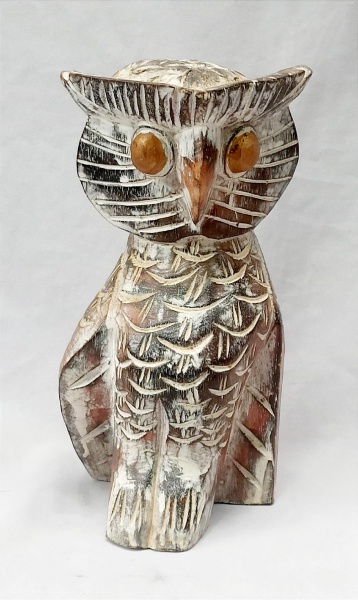• ARTE POPULAR, uma (1) escultura animalista representando coruja, entalhada em madeira, patina em decape, possui rachado, sem assinatura aparente, medindo 25,5 cm altura, vide foto.