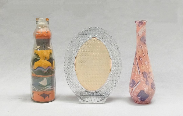 • VIDRO, três (3) itens, incolores e translúcidos: 1 garrafa reaproveitada para escultura em areia colorida, arte popular representando barcos, peixes, pássaros e elementos vegetalistas, medindo 17 cm altura; 1 porta-retratos, oval, parte de traz com modelagem geometrizada, medindo 16 cm altura; 1 vaso solifleur, recoberto com decalque policromado com predominância da tonalidade rosa, medindo 17 cm altura, todos os itens com sinais de uso, vide foto.