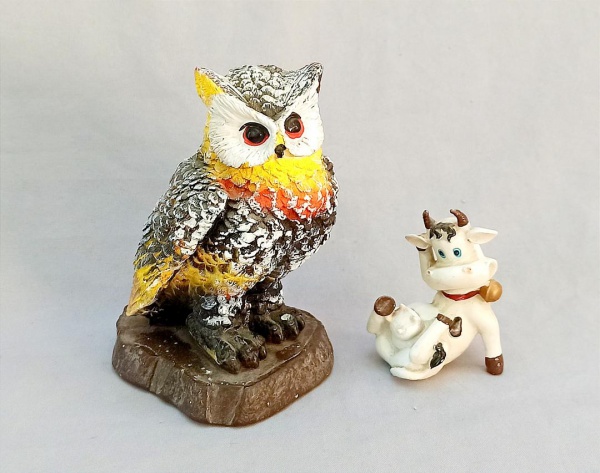 • ESCULTURAS, duas (2) distintas policromadas: 1 representando vaca holandesa com forma caricata, confeccionada em resina, medindo 9,5 cm altura; 1 representando coruja, confeccionada em estuque, pequenas falhas, medindo 15,5 cm altura, vide foto.