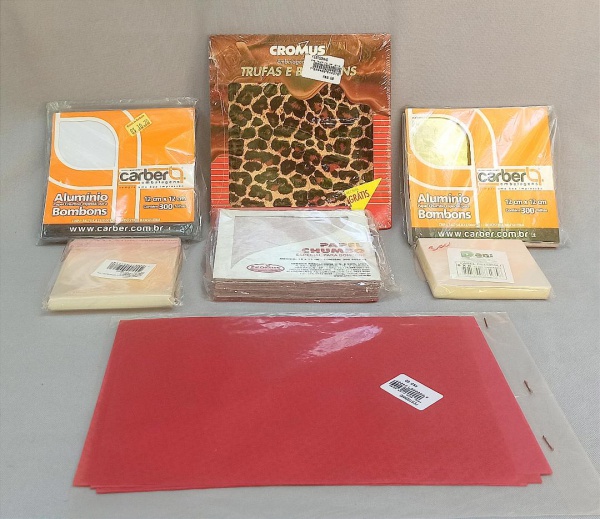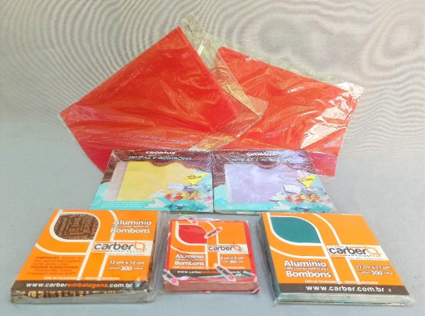 • DIVERSOS, sete (7) pacotes lacrados com embalagens para trufas e bombons, modelos, cores, tamanhos e marcas variadas, totalizando mais de 1000 embalagens, vide foto.