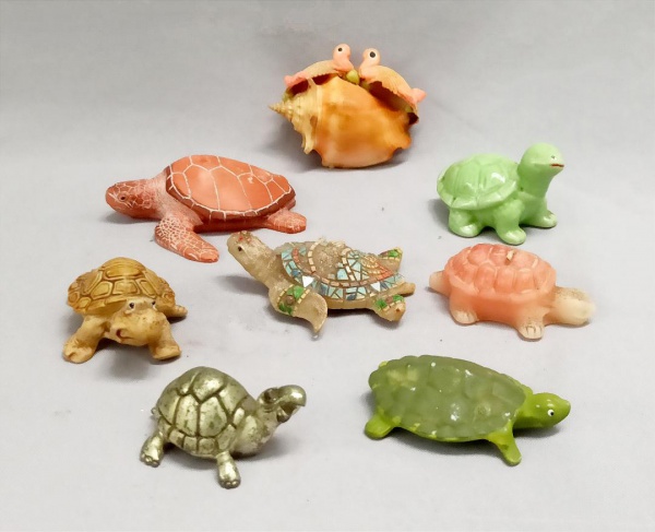 • ESCULTURAS, oito (8) animalistas representando tartarugas, confeccionadas em materiais variados: porcelana; resina; concha; cera (vela aromática); etc., algumas com pequenas perdas e defeitos, medindo a maior 9 cm comprimento, ideais para coleção temática, vide foto.