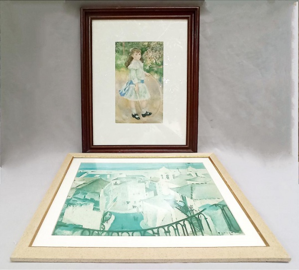 • LITOS, duas (2) distintas policromadas: 1 reprodução baseada na obra de BOTELHO, representando paisagem com marina e casarios, envidraçada, medindo com moldura 53 x 41 cm; 1 reprodução baseada na obra de RENOIR, representando menina, envidraçada, medindo com moldura 42 x 53 cm, vide foto.