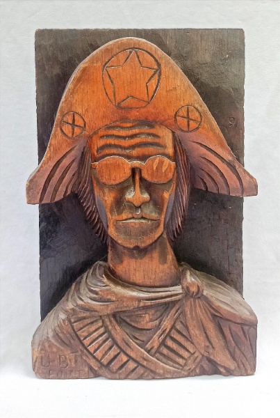 • ARTE POPULAR, uma (1) talha representando busto do cangaceiro Lampião, entalhado em madeira maciça, assinada em cavo MOISES no verso, frente com a legenda U-B-T-FORT., medindo 39,5 x 25,5 x 7 cm, vide foto.