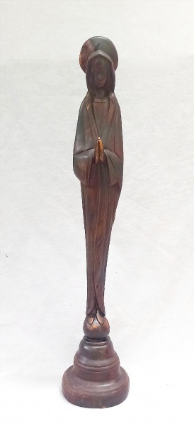 • ARTE RELIGIOSA POPULAR, uma (1) imaginária de Nossa Senhora da Conceição, entalhada em madeira, base quebrada e colada, medindo 52,5 cm altura, vide foto.