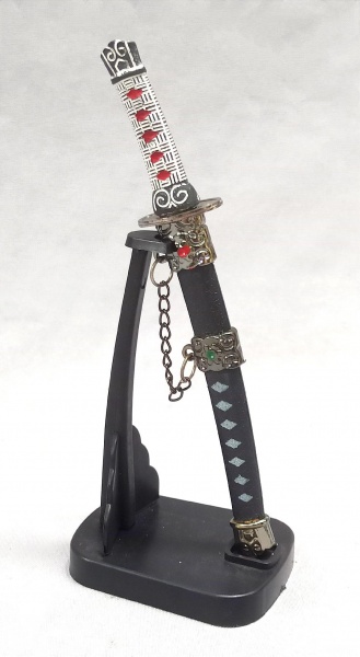 • CUTELARIA, uma (1) miniatura de Katana, confeccionada em materiais variados, medindo 16,5 cm comprimento, acompanha suporte expositor, vide foto.