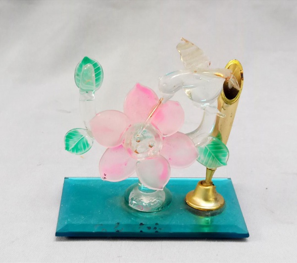• ESCULTURA, uma (1) representando beija flor, confeccionada em vidro na técnica dos Grandes Mestres Vidreiros de Murano, base espelhada, traz em um dos lados haste para caneta em metal dourado, medindo 10 x 6 x 9 cm, sinais de uso, vide foto.