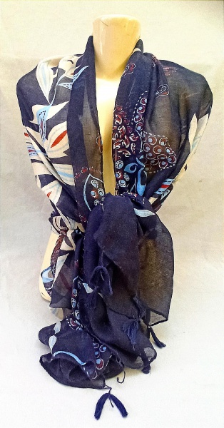 • ACESSÓRIO FEMININO, um (1) lenço confeccionado em tecido de poliéster na tonalidade azul marinho, com estampa floral policromada, acabamentos em tassels, tamanho único, vide foto.