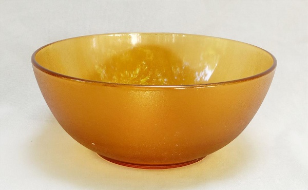 • VIDRO, uma (1) saladeira tipo bowl, modelagem em caneluras e texturização, tonalidade âmbar, translúcida, sem marca de manufatura aparente, medindo 22,5 cm diâmetro e 9 c altura, sinais de uso, vide foto.