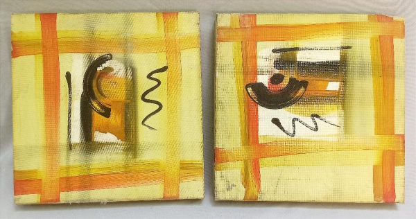 • QUADROS, par (2) pinturas abstratas, OST, assinadas e datadas 63 no verso, ambas sem moldura, assinaturas não identificadas, medindo 30 x 30 cm, vide foto, uma delas roída na lateral.