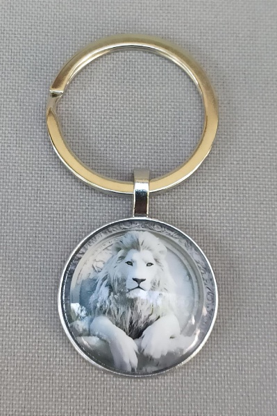• COLECIONISMO, um (1) chaveiro confeccionado em metal prateado com aplique representando leão branco, confeccionado em polímero policromado, novo e sem uso, medindo 6 cm, também pode ser usado como pingente, vide foto.