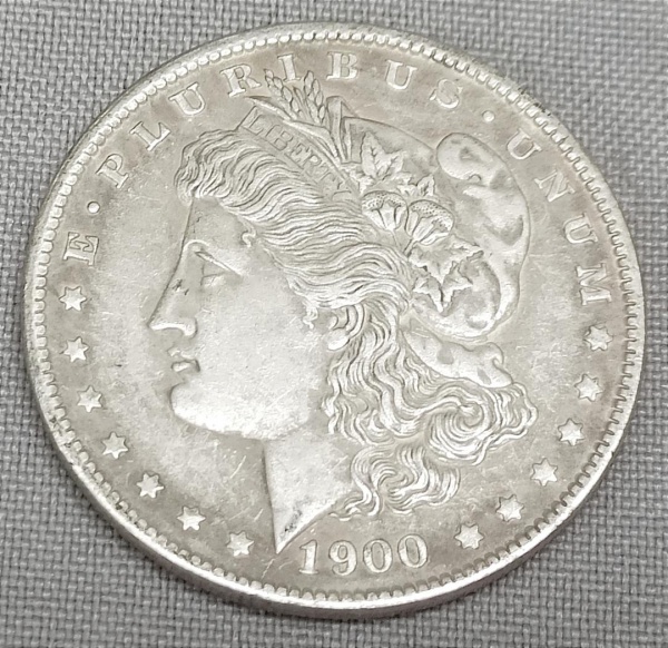 • NUMISMÁTICA, USA, uma (1) réplica da moeda de 1 dólar, 1900 S, 38mm diâmetro, confeccionada em metal prateado, popularmente conhecida como MORGAN, designer George T. Morgan.