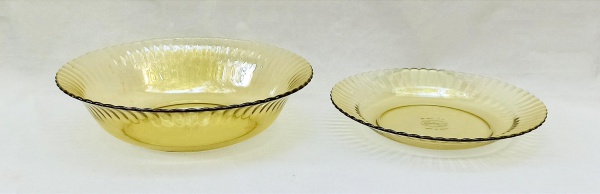 • VIDRO, dois (2) itens na tonalidade âmbar claro, translúcidos, manufatura COLOREX, sendo: 1 saladeira tipo bowl, borda canelada, medindo 24 cm diâmetro e 6 cm altura; 1 prato fundo, na mesma padronização, medindo 22 cm diâmetro, ambos com sinais de uso, vide foto.