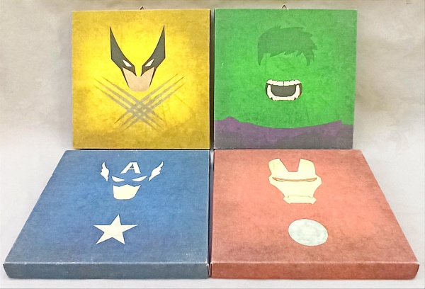 • QUADROS, quatro (4) distintos, representando silhuetas coloridas de Super Heróis, estampa colorida sobre tela, sem moldura, medindo com o chassi de madeira 20 x 20 cm, vide foto.