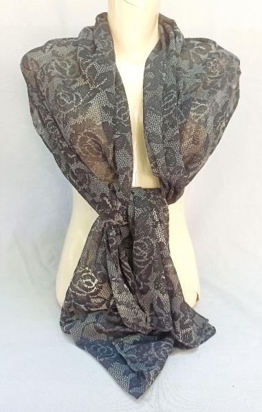 • ACESSÓRIO FEMININO, um (1) cachecol, confeccionado em poliéster, tonalidade cinza chumbo e preto, estampa florida, medindo 180 x 50 cm, usado, vide foto.