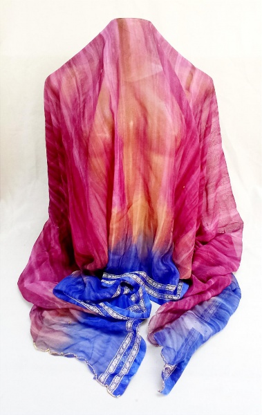 • ACESSÓRIO FEMININO, um (1) lenço longo usado como xale ou estola, confeccionado em poliéster, estampa pintada a mão em tons de lilás, vinho, salpicos de lantejoulas douradas, pontas com bordado industrial, acabamento lateral com linha metalizada dourada, medindo 180 x 110 cm, usado, vide foto.