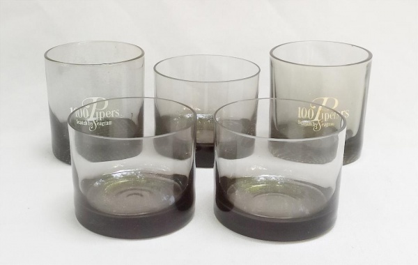 • VIDRO, cinco (5) copos para whisky, cilíndricos, tonalidade fume, translúcidos, dois modelos distintos, sendo: 2 com propaganda do whisky escocês 100 PIPERS  Scotch by Seagram, medindo 8,5 cm altura e 8 cm diâmetro; 3 medindo 7,5 cm altura e 9 cm diâmetro, todos os itens com sinais de uso, vide foto.