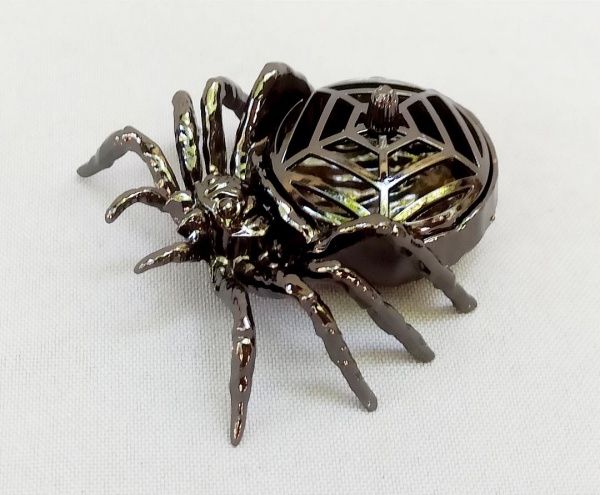 • BRONZE, um (1) incensório com tampa no formato de aranha, confeccionado em metal grafitado, tampa vazada em teia estilizada, medindo 5,5 cm comprimento, vide foto.